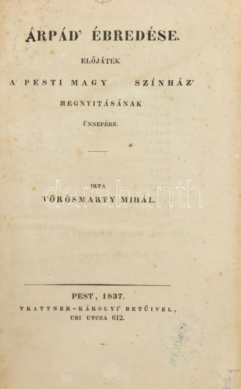 Vörösmarty Mihál(y): Árpád' ébredése. Előjáték a' Pesti Magy... https://www.darabanth.com/en/454-Online-auction/454.0/Books/Books-Other-rarities~1500035/Vorosmarty-Mihaly-Arpad-ebredese-Elojatek-a-Pesti-Magyar-Szinhaz-megnyitasanak-~II3029885