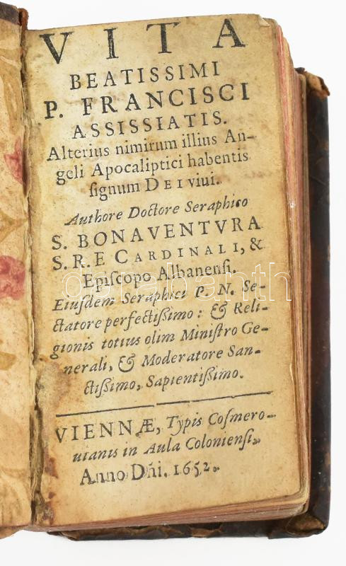 Bonaventura, S[anctus]: Vita beatissimi p[atris] Francisci Assissiatis. Alterius nimirum illius Angeli Apocaliptiei habentis signum Dei viui. Authore doctore serapahico --. Viennae [Bécs], 1652. Typis Cosmerovianis in Aula Coloniensi. [16] + 558 p. Szent Bonaventura, vagy Bagnoregiói Bonaventura (Bagnorea, 1221 - Lyon, 1274) himnuszköltő, teológiai író, a minorita (ferences) rend fő elöljárója, albanói érsek. Korabeli egészbőr-kötésben, sarkokon kopással. 9 cm