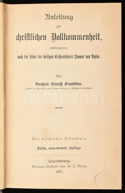 Grundfötter, Bernhard Heinrich: Anleitung zur christlichen Vollkommenheit, insbesondere nach der Lehre des heiligen Kirchenlehrers Thomas von Aquin. Regensburg, 1891, Verlags-Anstalt vorm G. J. Manz, XXVIII+625+(3) p. Német nyelven. Átkötött, aranyozott gerincű félvászon-kötésben, kissé foltos gerinccel, belül jó állapotban.