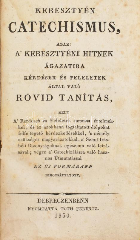 Description: Keresztyén Catechismus, Az-az: A' Keresztényi Hitnek Ágazatira Kérdések és Feleletek által való rövid tanitás... Debrecenben, 1830. Tóth Ferentz. 336p. Korabeli, kissé kopott egészbőr kötésben Ritka!