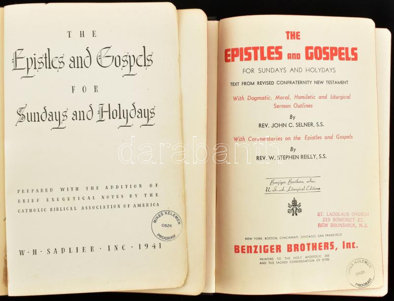 The Epistles and Gospels for Sundays and Holidays. hn., 1941., W. H. Sadlier Inc. Angol nyelven. Kiadói egészvászon-kötésben, kopott borítóval, sérült gerinccel, a táblák belsején a papír részben lejött. + The Epistles and Gospels for Sundays and Holidays. Text from revised confraternity new testament. With dogmatic, moral, homiletic and liturgical sermon outlines by Rev. John C. Selner S. S. With commentaries on the epistles and gospels by Rev. W. Stephen Reilly S.S. New York, (1947), Benziger Brothers. Kiadói kopott egészvászon-kötésben, kopott borítóval, intézményi bélyegzéssel.