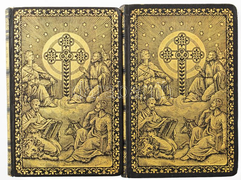 Újszövetségi Szentírás 1-2. köt. A Vulgata szerint Káldi György S. J. fordítása nyomán, tekintettel az eredeti szövegre, átdolgozta, bevezetésekkel és jegyzetekkel ellátta a Szent István-Társulat Szentírás-Bizottsága. Bp.,(1927-1928.),Szent István-Társulat. A borítón Akantisz Viktor festőművész bibliai tárgyú képével. Kiadói dúsan aranyozott, illusztrált egészvászon-kötés, kissé kopott, kissé foltos borítóval, de alapvetően jó állapotban.
