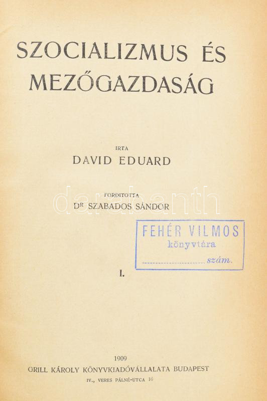David Eduard: Szocializmus és mezőgazdaság. I-II. kötet. Ford.: Dr. Szabados Sándor. Társadalomtudományi Könyvtár. Bp., 1909, Grill Károly, 374+(2) p., 376 p. Kiadói egészvászon-kötés, fakó gerinccel, néhány kissé sérült lappal, az I. kötet gerincén kisebb sérülésekkel, a belső kötéstáblákon ex libris-szel, a címlapokon tulajdonosi névbélyegzővel.