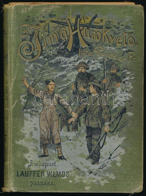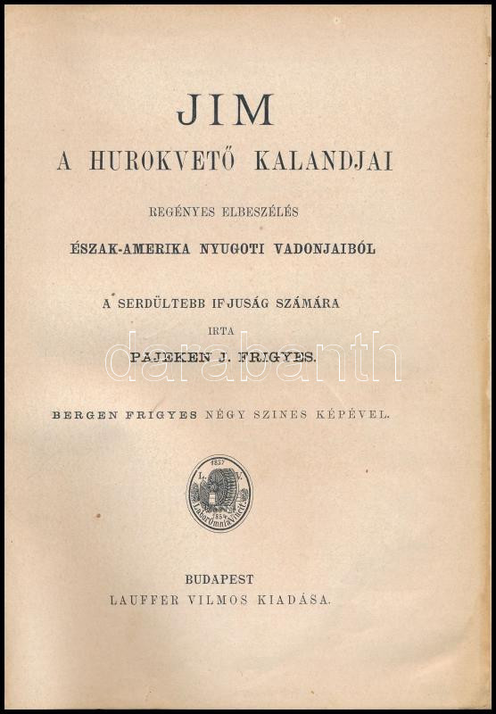 [Pajeken, Friedrich Joachim] Pajeken Frigyes: Jim, a hurokvető kalandjai. Regényes elbeszélés Észak-Amerika nyugati vadonjaiból. A serdültebb ifjúság számára írta - - . Bergen Frigyes négy színes képével. Bp., [1892], Lauffer Vilmos (Rudnyánszky A.-ny.), 2 sztl. lev.+ 169+(1) p.+ 4 (színes litográfiák) t. Kiadói illusztrált egészvászon-kötés, kissé sérült, kopott borítóval, helyenként sérült, kissé foltos lapokkal, korabeli ajándékozási bejegyzéssel, néhány lap kijár.