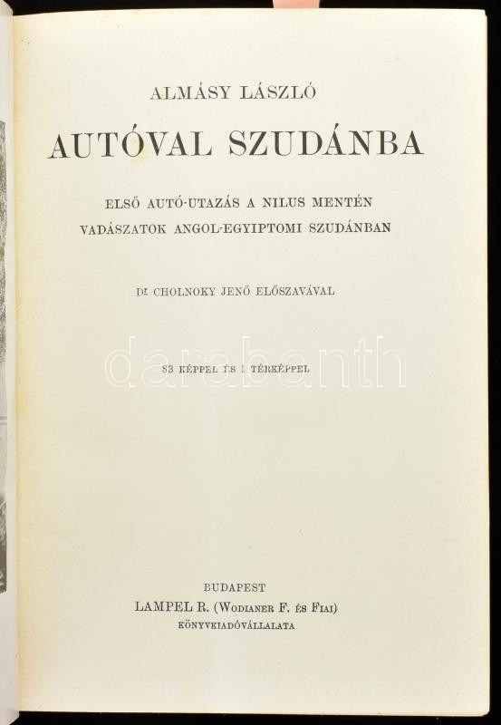 Almásy László (1895-1952): Autóval Szudánba. Első autó-utazás a Nílus mentén, vadászatok angol-egyiptomi Szudánban. Dr. Cholnoky Jenő előszavával. Magyar Földrajzi Társaság Könyvtára. Bp.,[1929.], Lampel R. (Wodianer F. és Fiai) Rt., 1 t.(címkép)+ 240 p.+28 t. (kétoldalas, fekete-fehér fotók.)+ 1 térkép. Fekete-fehér fotókkal illusztrálva. Kiadói dúsan aranyozott egészvászon sorozatkötésben, a borítón egészen kis kopásnyomokkal.