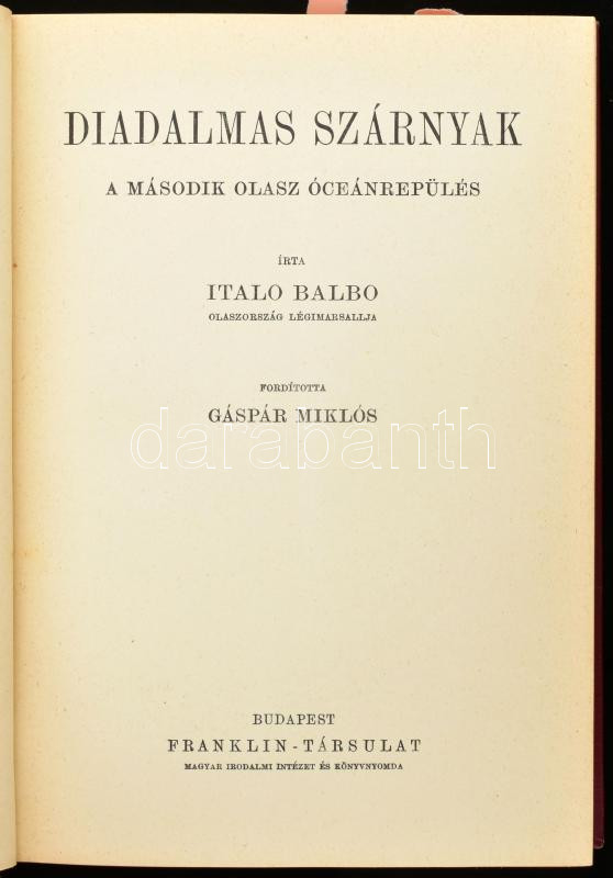 Balbo, Italo (1896-1940): Diadalmas szárnyak. A második olasz óceánrep... https://www.darabanth.com/en/454-Online-auction/454.0/Books/Books-Travelling-Local-History~1500014/Balbo-Italo-1896-1940-Diadalmas-szarnyak-A-masodik-olasz-oceanrepules-Ford-Gaspar-Mi~II3025965