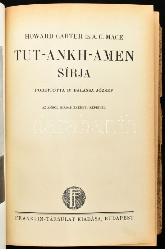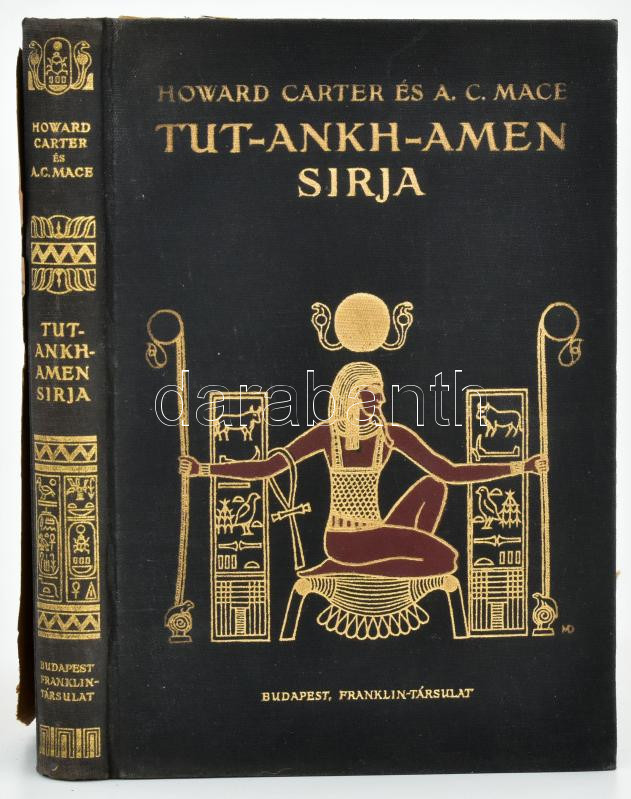 Carter, Howard - Mace, A[rthur] C[ruttenden]: Tut-Ankh-Amen sírja. Ford.: Dr. Balassa József. Az angol kiadás eredeti képeivel. Modern Utazók Felfedezők Könyvtára. Bp., [1929], Franklin-Társulat, 1 t.+ 169+(1) p.+ 62 t. Egészoldalas, fekete-fehér képekkel illusztrált. Kiadói aranyozott egészvászon-kötés, jó állapotban, a kiadói papírborító sérült, szétvált állapotban, de megvan.