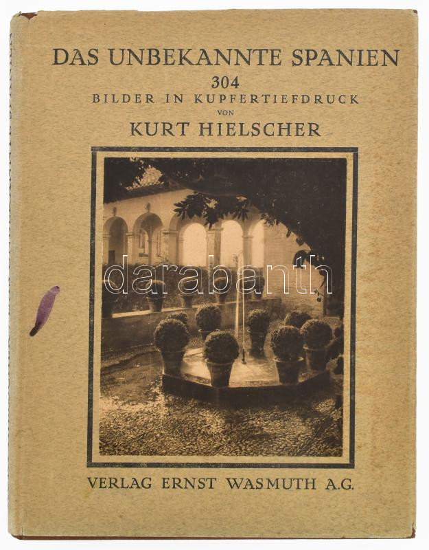 Hielscher, Kurt: Das unbekannte Spanien. Baukunst, Landschaft, Volksleben. Berlin, 1922, Ernst Wasmuth A.G., XXII+(2)+304 p. Rendkívül gazdag egészoldalas képanyaggal illusztrálva. Német nyelven. Kiadói aranyozott egészvászon-kötés, kissé sérült kiadói papír védőborítóban.