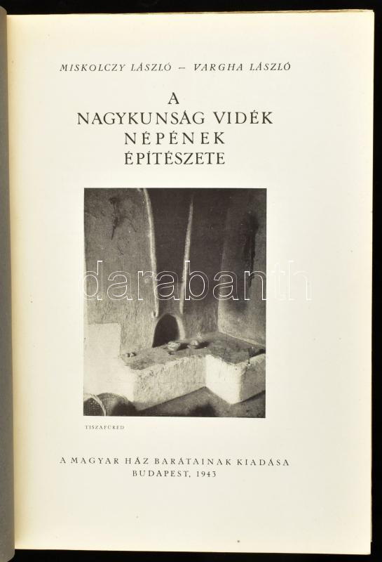 Miskolczy László - Vargha László: A Nagykunság vidék népének építészete. Padányi Gulyás Jenő bevezetőjével. Bp., 1943, Magyar Ház Barátainak Kiadása, XLVII+(1)+141+(1) p. Az 1-138. oldalakon fekete-fehér fotókkal. Kiadói papírkötés, jó állapotban, minimálisan sérült kiadói papír védőborítóban.