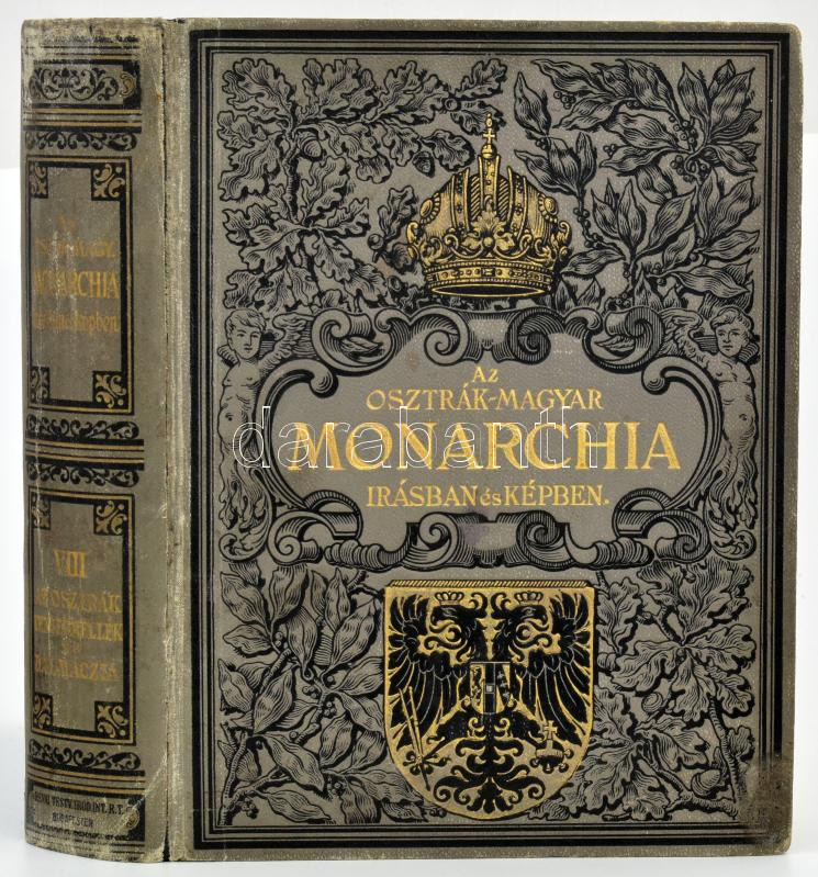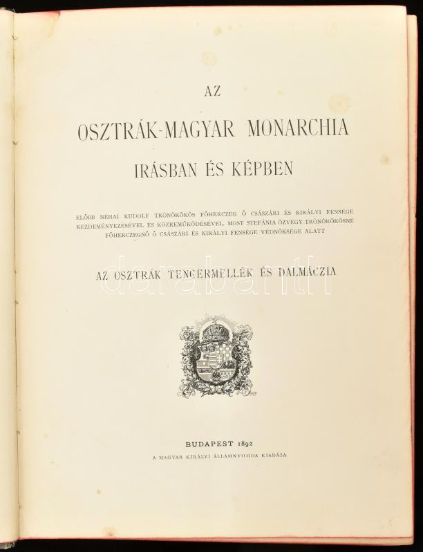 Osztrák-Magyar Monarchia írásban és képben VIII. köt.: Az osztrák Tengermellék és Dalmácia. Bp., 1892., M. Kir. Államnyomda, XVI+732 p.+ 1 (színes képtábla.) Nagyon gazdag egészoldalas és szövegközti képanyaggal illusztrált. Kiadói aranyozott, festett egészvászon-kötés, gerincen kis sérüléssel, kopással,