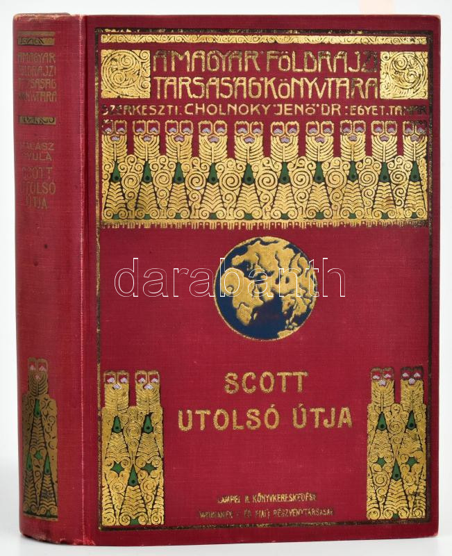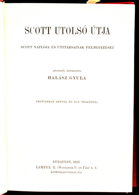 [Scott, Robert Falcon (1868-1912)] Scott utolsó útja. Scott naplója és útitársainak feljegyzései. FordÃtotta Halász Gyula. Negyven képpel és egy térképpel. Magyar Földrajzi Társaság Könyvtára. Bp.,1923, Lampel R. (Wodianer F. és Fiai) Rt., 404 p.+ 1 (kétoldalas térkép) t. Szövegközti fekete-fehér fotókkal. Kiadói dúsan aranyozott egészvászon sorozatkötésben, kopott borÃtóval, de belül jó állapotban.