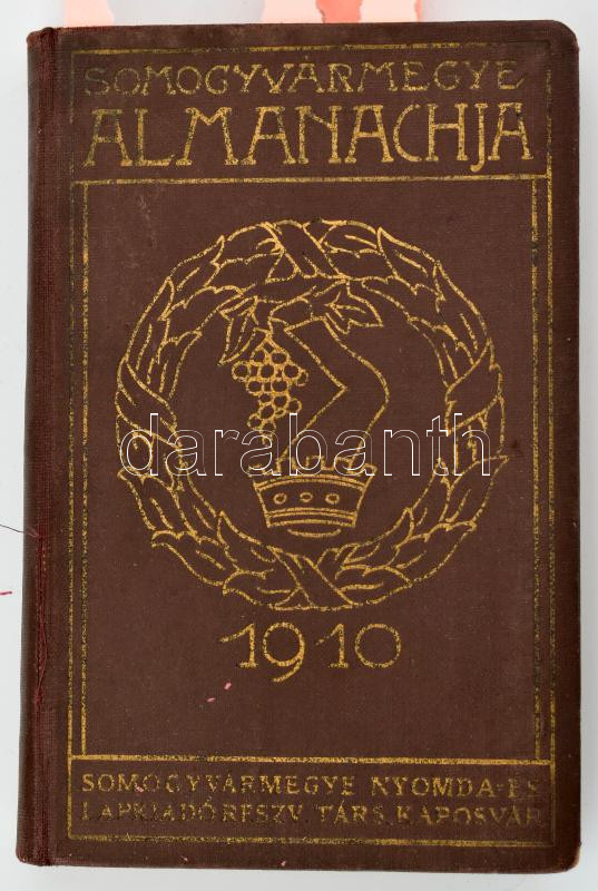 Somogyvármegye Almanachja 1910. Ötödik évfolyam. Kaposvár, 1910., Részvénynyomda, 4+238+XXXVI (hirdetések) p.+2 t. Izgalmas korabeli reklámokkal. Kiadói szecessziós egészvászon-kötés, kopott borítóval, két kijáró lappal.