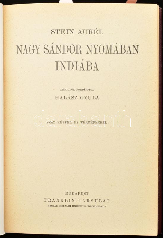 Stein Aurél (1862-1943): Nagy Sándor nyomában Indiába. Ford.: Halász Gyula. Magyar Földrajzi Társaság Könyvtára. Bp.,[1931], Franklin, 1 t. (cÃmkép)+183 p.+32 (kétoldalas fekete-fehér képtáblák). Két egészoldalas térképpel. Kiadói dúsan aranyozott egészvászon sorozatkötésben,a borÃtón kis kopásnyomokkal, de alapvetÅ‘en jó állapotban.