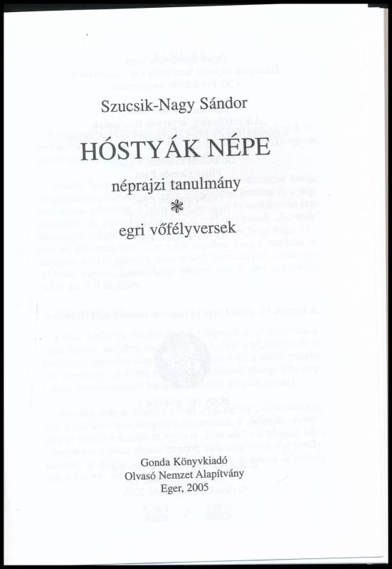 Szucsik-Nagy Sándor: Hóstyák népe. Néprajzi tanulmány. Egri vőfélyesek. Eger, 2005, Gonda Könyvkiadó - Olvasó Nemzet Alapítvány. Kiadói egészműbőr-kötés.