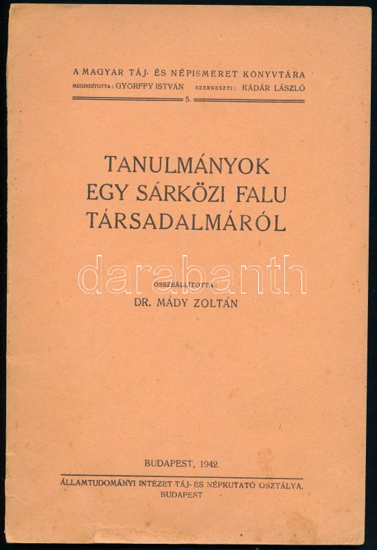 Description: Tanulmányok egy sárközi falu társadalmáról. Összeáll.: Mády Zoltán. A Magyar Táj- és Népismeret Könyvtára 5. Bp., 1942, Államtudományi Intézet Táj- és Népkutató Osztálya, (Élet-ny.), 70+1 p. Kiadói papírkötés.