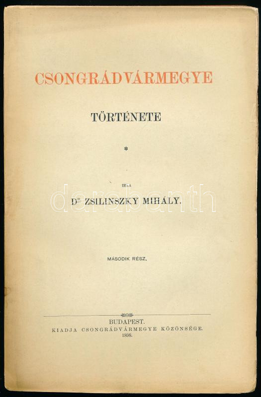 Zsilinszky Mihály: Csongrádvármegye története II. rész. Bp., 1898, Csongrádvármegye Közönsége, (Wodianer-ny.), 2+334+2 p. Kiadói papírkötés, foltos gerinccel, felvágatlan lapokkal.