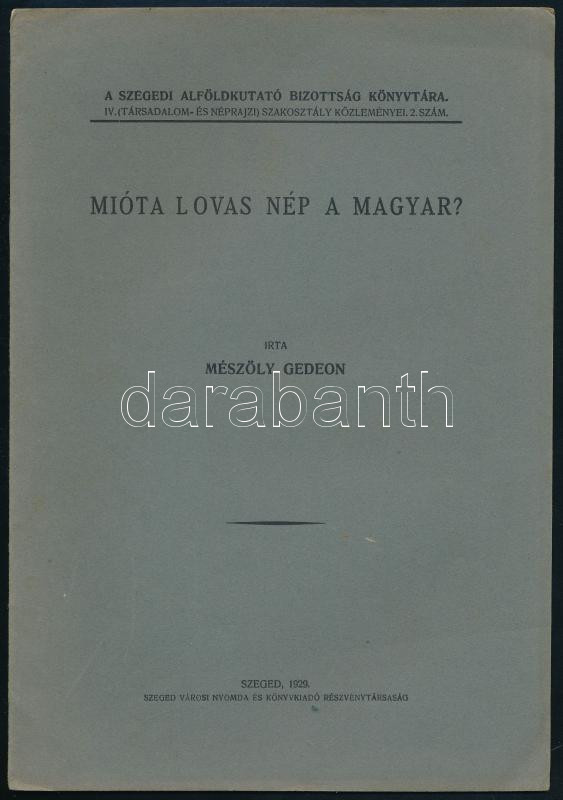 Mészöly Gedeon: Mióta lovas nép a magyar? Szegedi Alföldkutató Bizottság Könyvtára IV. 2. szám. Szeged, 1929,Szegedi Városi Nyomda, 12 p. Kiadói papírkötés.