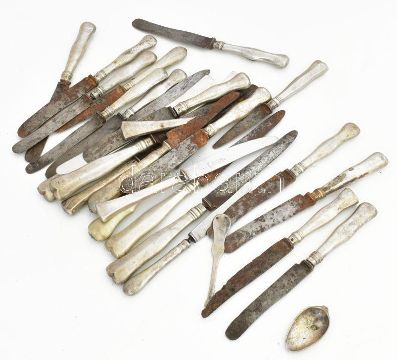 Ezüst (Ag) nyelű kések vegyes állapotú pengékkel, közötte hat darab egyforma is. Összesen 26 db + hozzá egy törött ezüst kanál. Dianás jelzéssel