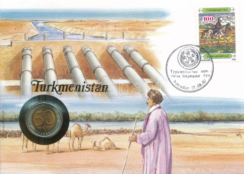 Description: Türkmenisztán felbélyegzett borítékban, bélyegzéssel, német nyelvű tájékoztatóval, benne Oroszország 1992. 50R bimetál T:UNC Turkmenistan in envelope with stamp, cancellation and a prospectus in german, in it Russia 1992. 50 Rubles bimetallic C:UNC