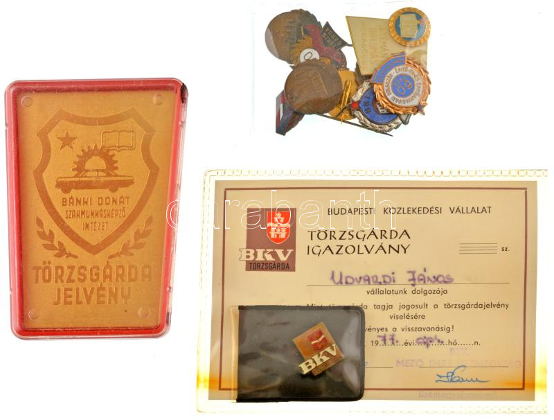 12db-os törzsgárda és szakszervezeti jelvényekből álló tétel, benne: "BKV Törzsgárda" jelvény és igazolvány, "Villamosenergia ipar - 10 év hűségért" (3x), "Vendéglátóipari Törzsgárda", "HKI Törzsgárda", "Szöv. ipar Törzsgárda", "60 év - Gyémántdiplomás Pedagógus", "60 éves Építő-, Fa- és Építőanyagipari Dolgozók Szakszervezete" stb. T:AU-VF egyik jelvény tűje letört