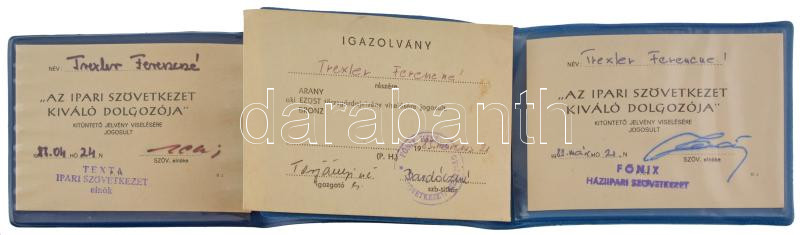 1982-1987. "Az Ipari Szövetkezet Kiváló Dolgozója" aranyozott, részben festett kitüntető jelvény (2x) mindkettő viselői igazolvánnyal, dísztokban T:UNC,AU