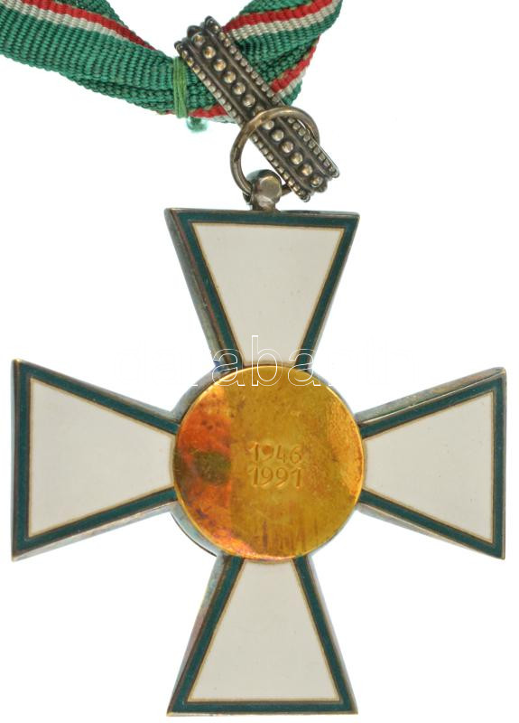 1991. "Magyar Köztársasági Érdemrend nagykeresztje, polgári tagozat" zománcozott, részben aranyozott, karikán jelzett Ag kitüntetés, a középkereszt 40mm-es nyakszalagjával T:AU NMK.: 733.