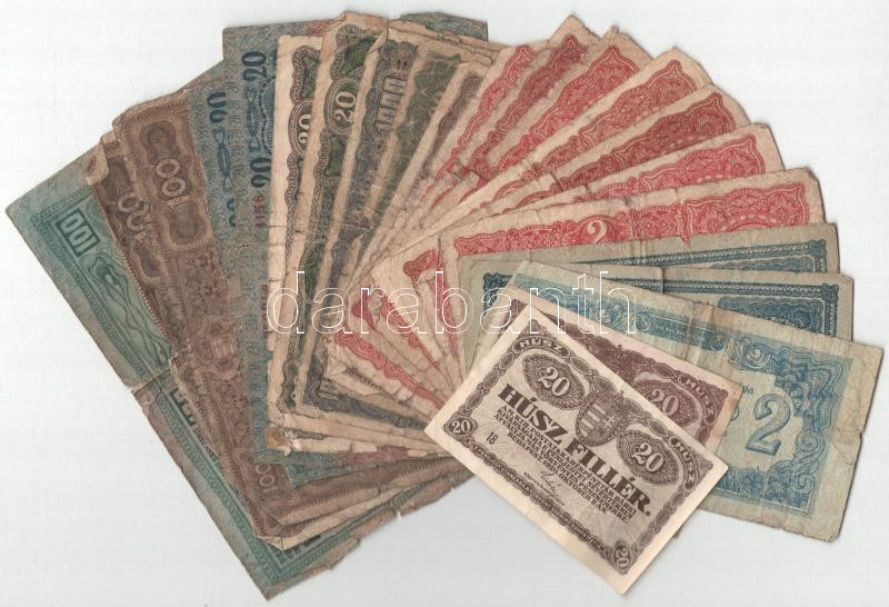 https://www.darabanth.com/en/454-Online-auction/454.0/Numismatics/Hungarian-Banknotes~2000007/21db-vegyes-korona-pengo-bankjegy-gyenge-allapotban-TF-G~II3026584