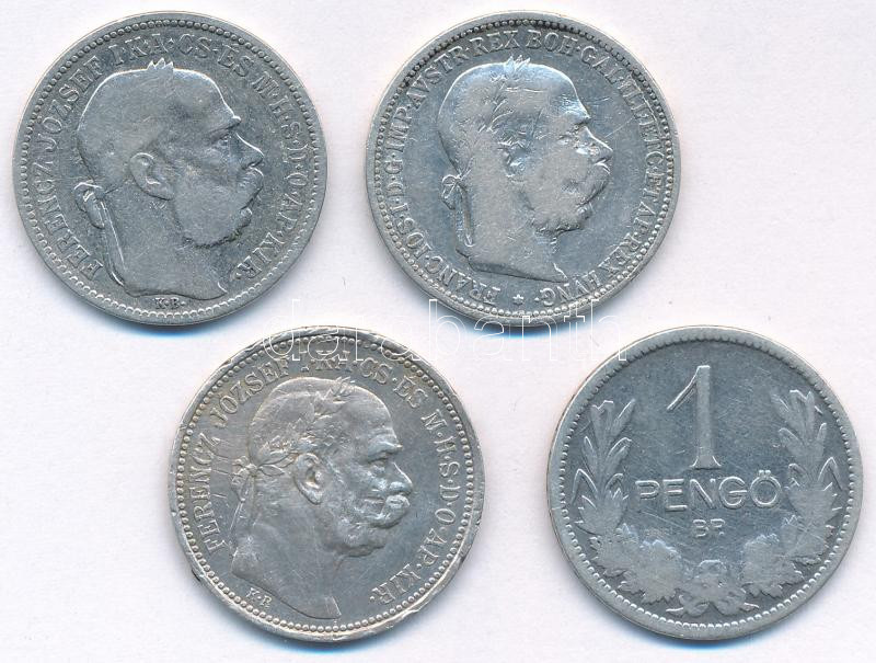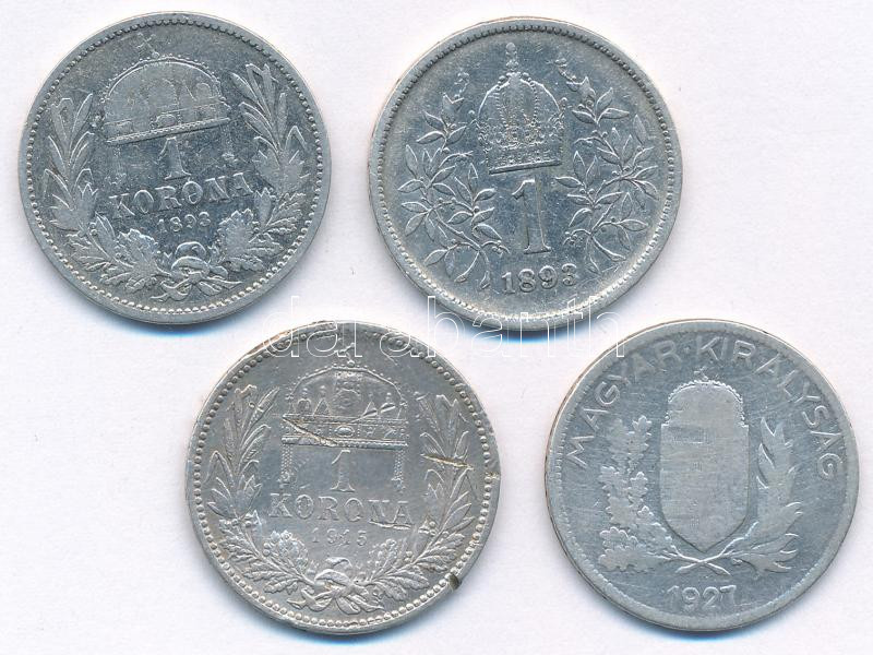1893. 1K Ag "Ferenc József" + 1915. 1K Ag "Ferenc József" + 1927. 1P Ag + Ausztria 1893. 1K Ag "Ferenc József" T:VF,F közte ph, karc