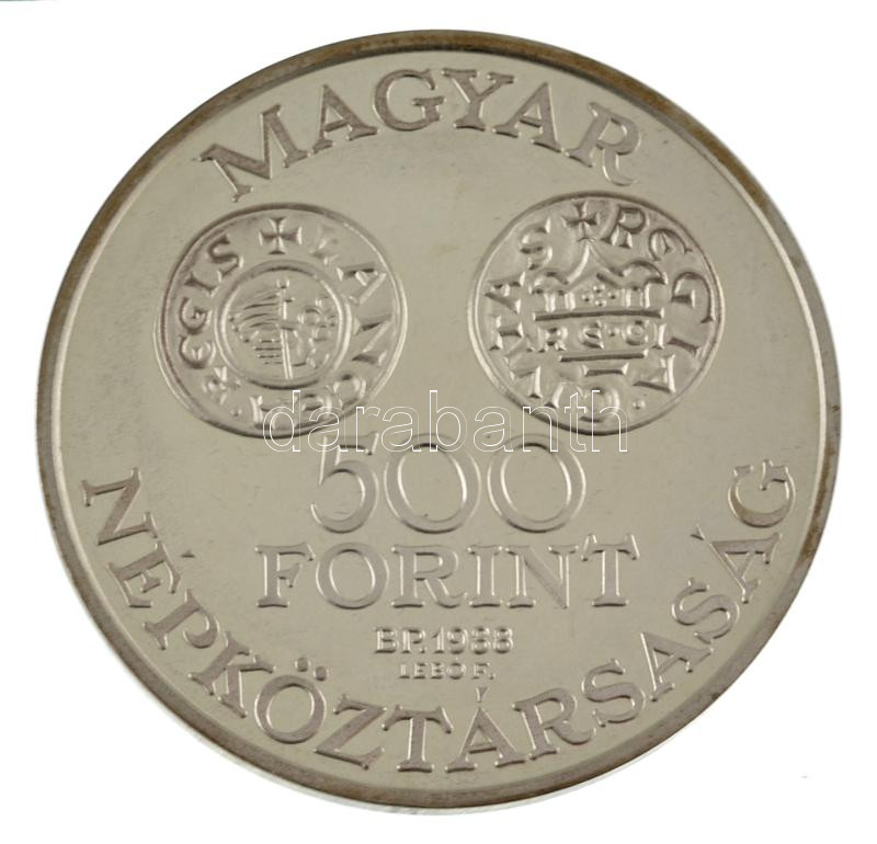 https://www.darabanth.com/en/454-Online-auction/454.0/Numismatics/Hungarian-coins-and-coins-with-Hungarian-mint-marks~2000008/1988-500Ft-Ag-Szent-Istvan-disztokban-TAU-PP-patina-Adamo-EM102~II3030091