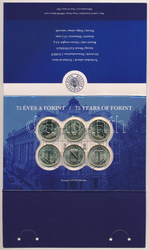 https://www.darabanth.com/en/454-Online-auction/454.0/Numismatics/Hungarian-coins-and-coins-with-Hungarian-mint-marks~2000008/2021-5Ft-Cu-Ni-Zn-75-eves-a-Forint-elso-napi-veret-6xklf-sorszam-nelkuli-emleklapon-TUNC~II3027504