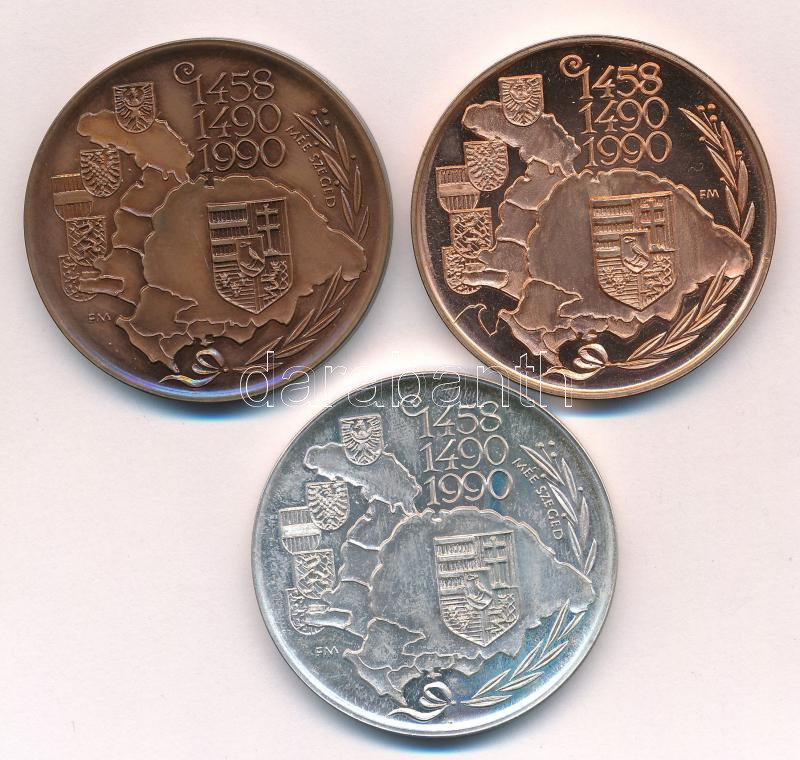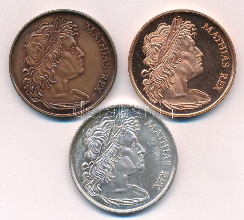 Description: Fritz Mihály (1847-) 1990. "Mathias Rex / MÉE Szeged - Mátyás király halálának 500. évfordulója" Ag, bronz és réz emlékérem sor (35,52g/0.835/42,5mm) T:UNC,AU (eredetileg PP)