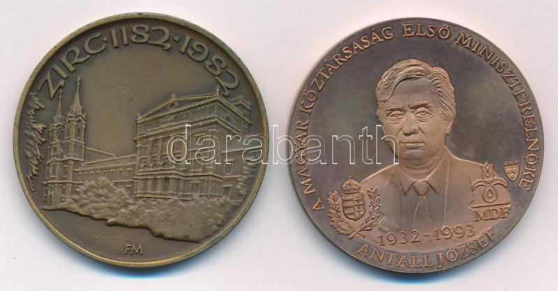 Description: Fritz Mihály (1947-) 1982. "Zirc" kétoldalas bronz emlékérem (42,5mm) + Bozó Gyula (1913-2004) 1993. "Antall József A Magyar Köztársaság Első Miniszterelnöke 1932-1993" bronz kétoldalas emlékérem (42mm) T:UNC