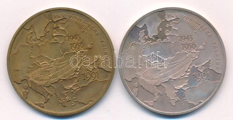 Description: Fritz Mihály (1947-) 1991. "Megszálló szovjet csapatok kivonulása / Pax vobis - Béke veletek / KONYEC" (2x) jelzett Ag és aranyozott emlékérem pár (31,46g/0.925/42,5mm) T:UNC,AU (eredetileg PP) patina