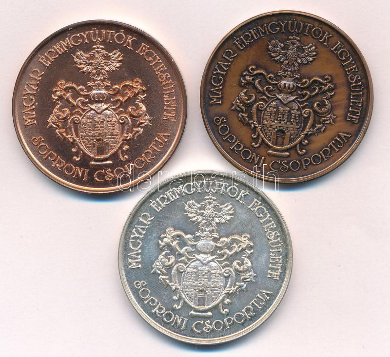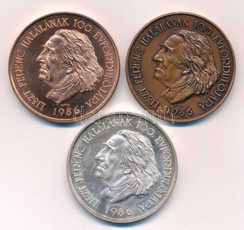 Description: Kutas László (1936-) 1986. "MÉE Sopron / Liszt Ferenc halálának 100. évfordulója" peremen jelzett Ag, bronz és réz emlékérem sor (35,78g/0.835/42,5mm) T:UNC,AU (eredetileg PP)