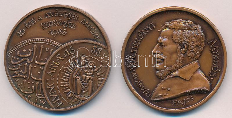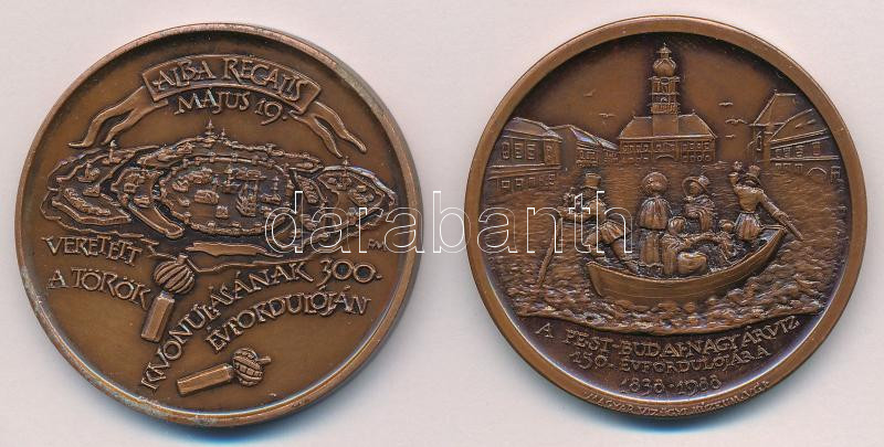 Lapis András (1942-) 1988. "Wesselényi Miklós, az árvízi hajós / A pest-budai nagy árvíz 150. évfordulójára 1838-1988 - Magyar Vízügyi Múzeum, VGI" kétoldalas bronz emlékérem (42,5mm) + Fritz Mihály (1947-) 1988. "20 éves a MÉE Fejér megyei Szervezete / Alba Regalis május 19. - Veretett a törökök kivonulásának 300. évfordulóján" kétoldalas bronz emlékérem (42,5mm) T:UNC,AU