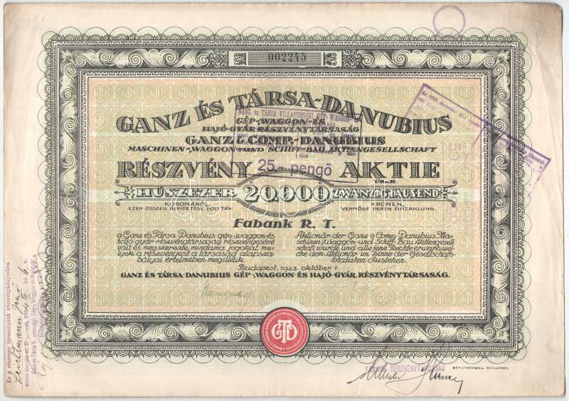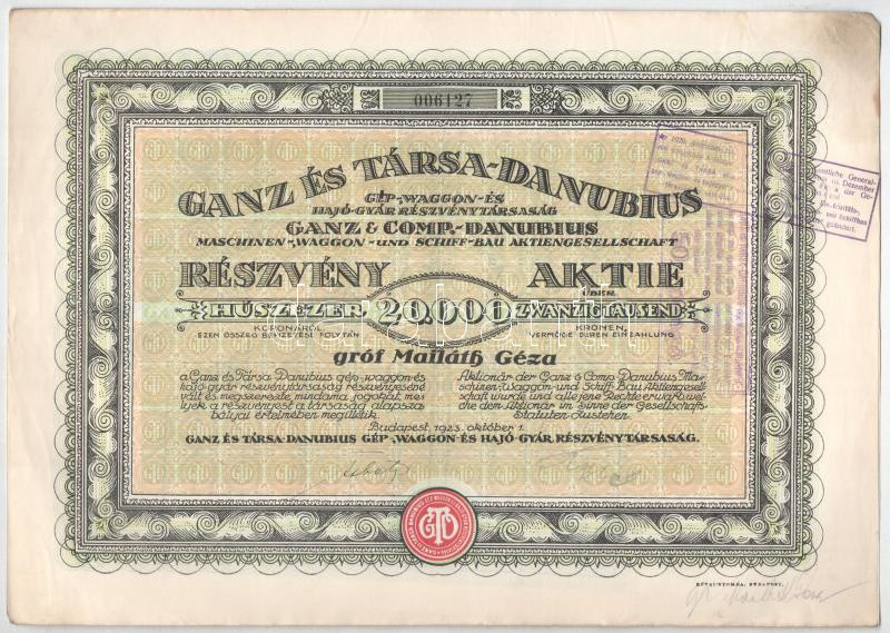 Budapest 1923. "Ganz és Társa-Danubius Gép-, Waggon- és Hajó-Gyár... https://www.darabanth.com/en/454-Online-auction/454.0/Numismatics/Shares-and-Tickets~2000005/Budapest-1923-Ganz-es-Tarsa-Danubius-Gep-Waggon-es-Hajo-Gyar-Reszvenytarsasag-reszv~II2970982