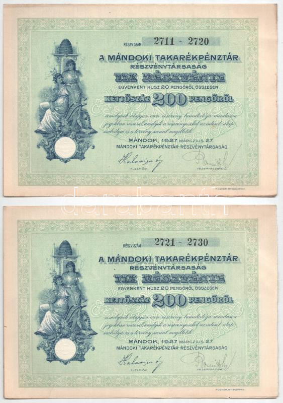 https://www.darabanth.com/en/454-Online-auction/454.0/Numismatics/Shares-and-Tickets~2000005/Mandok-1927-Mandoki-Takarekpenztar-Reszvenytarsasag-tiz-reszvenye-egyenkent-20P-rol~II2971926