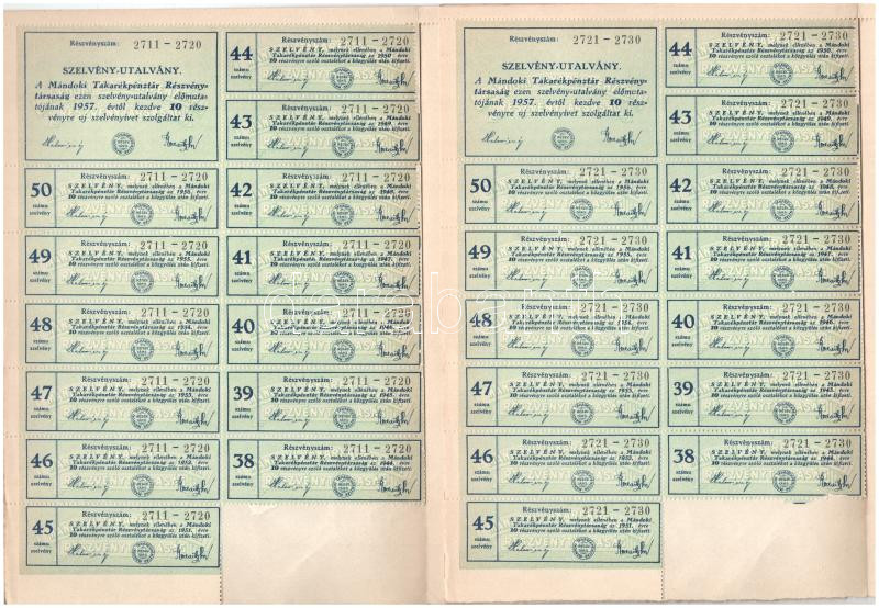 Mándok 1927. "Mándoki Takarékpénztár Részvénytársaság" tíz részvénye egyenként 20P-ről, összesen 200P-ről (2x) sorszámkövetők T:AU