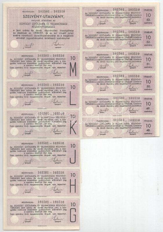 Újpest 1930. "Egyesült Izzólámpa és Villamossági Részvénytársaság" 10 részvénye egyben, összesen 1000P-ről, szárazpecséttel, szelvényekkel T:AU / Hungary / Újpest 1930. "United Incandescent Lamp and Electricity Share Company" 10 share in one, all about 1000 Pengp, with embossed stamp and coupons C:AU
