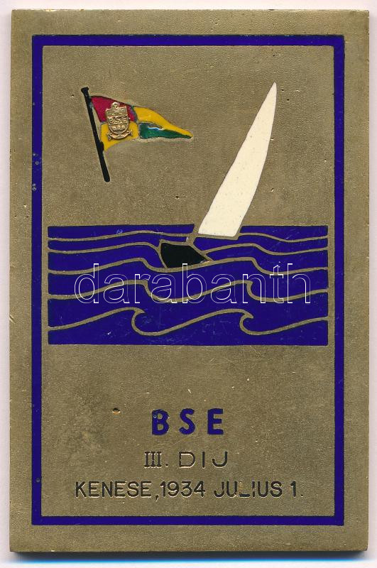 1934. "BSE (Budapest Sportegyesület) III. díj Kense, 1934. július 1." egyoldalas, részben zománcozott bronz vitorlás díjplakett (83x55mm) T:AU