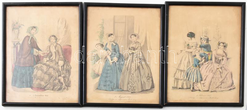 1851 3 db biedermeier divatkép. Színezett fametszet. Üvegezett keretben 15x22 cm