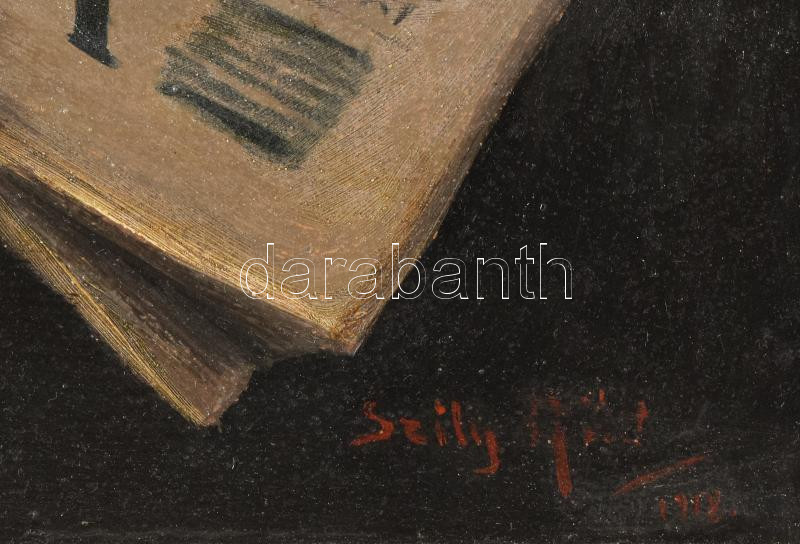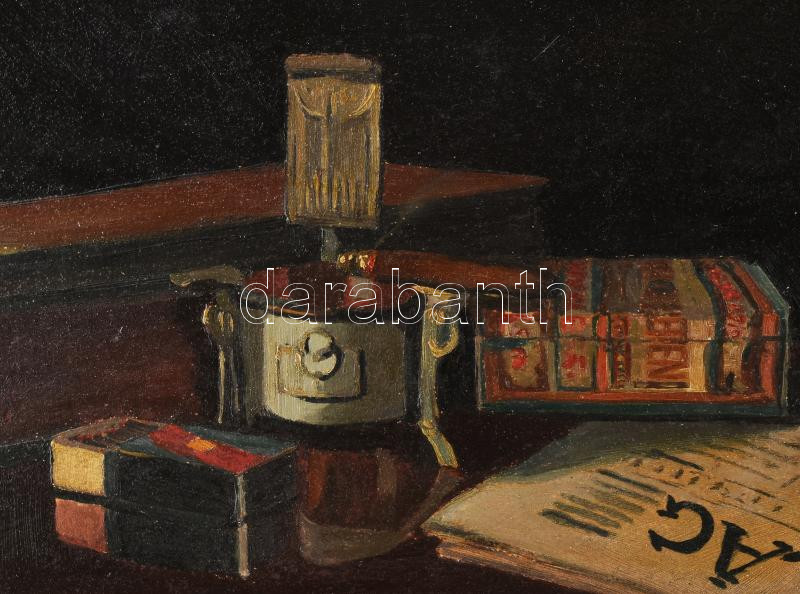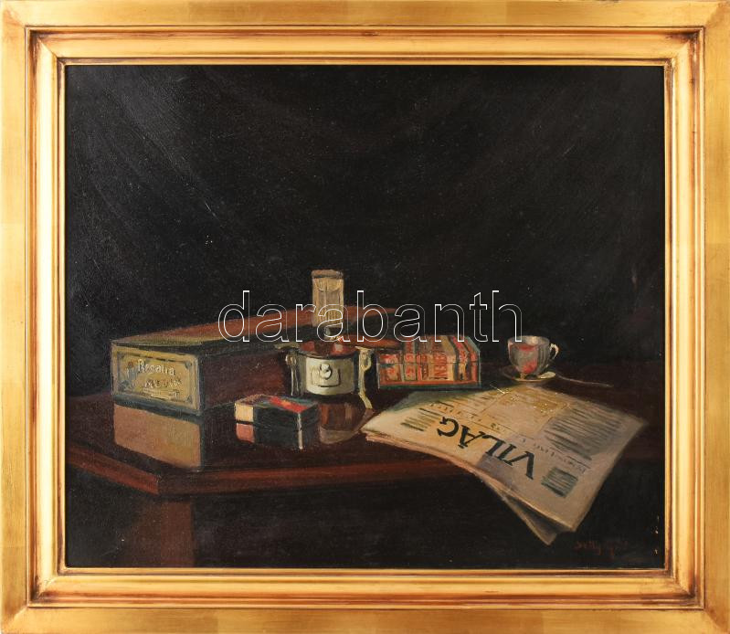 Szily jelzéssel, magyar festő, XX. sz eleje: Csendélet Regalia media szivarosdobozzal és Világ c. újsággal, 1918. Olaj, karton. Dekoratív fakeretben, hátoldalán Handelsmann budapesti képkeretező korabeli címkéjével. 50x60 cm