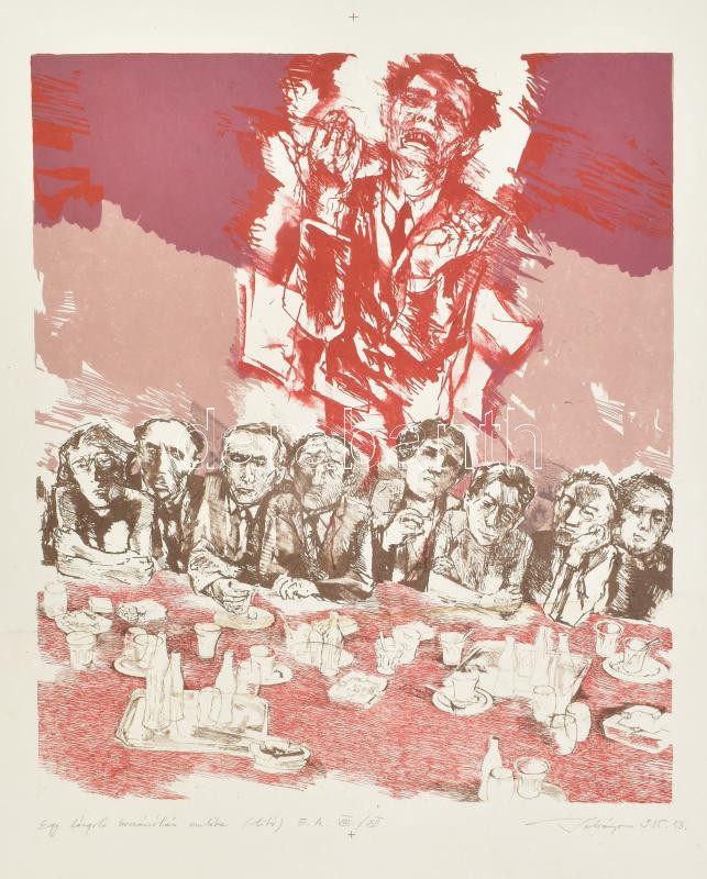 Bálványos Huba (1938-2011): Egy lángoló hozzászólás emléke, 1985. Litográfia, papír, jelzett, művészpéldány E.A. VIII. / XII. számozással, párdarabja reprodukálva: XIII. Országos Grafikai Biennálé, 1985, 14. oldal, törésnyommal, 39x33 cm
