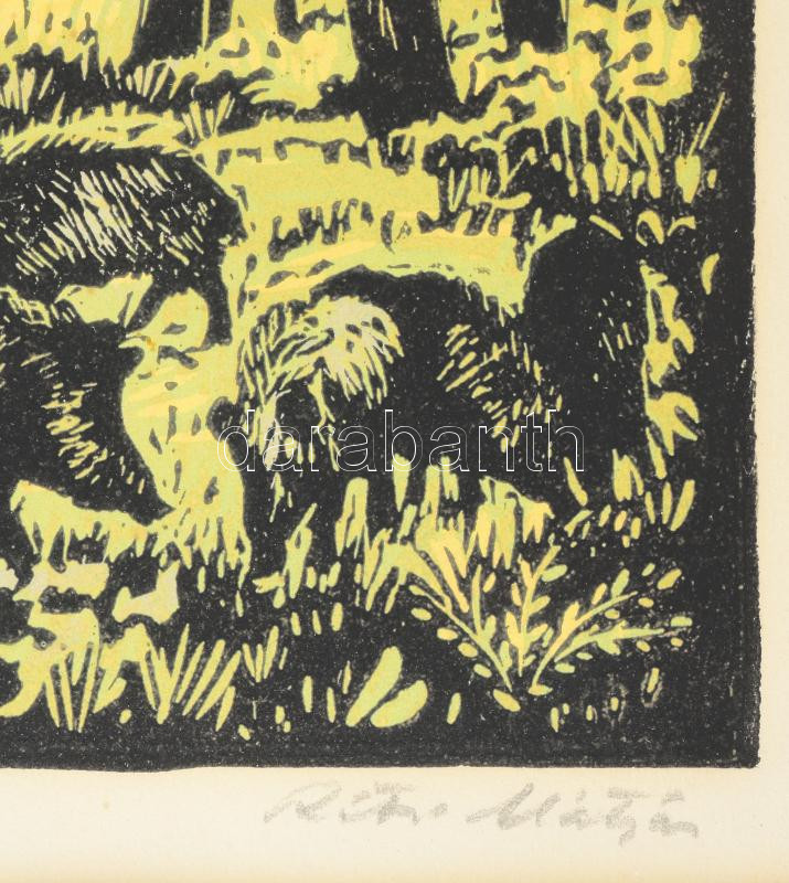 Réti Mátyás (1922-2002): Erdőben (vaddisznók). Színes linómetszet, pap...