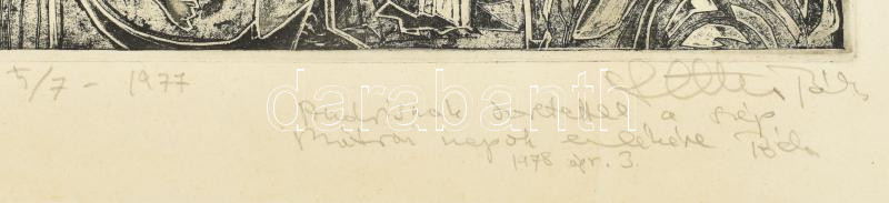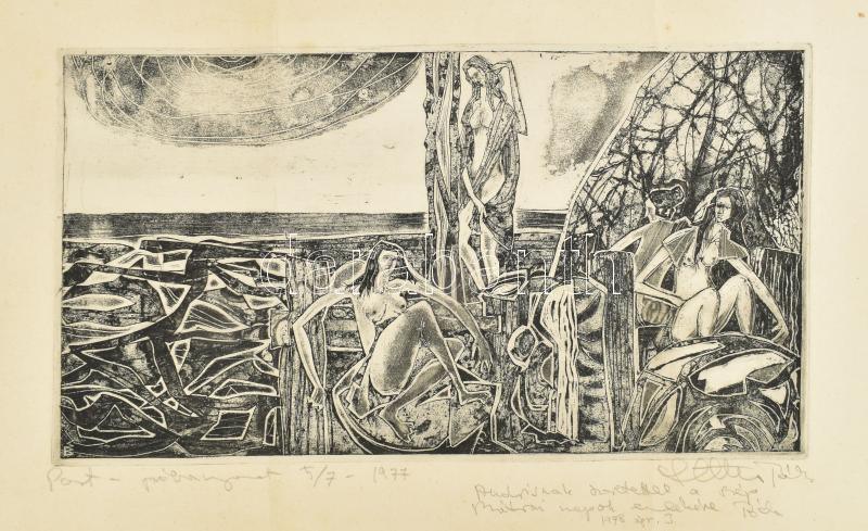 Stettner Béla (1928-1984): Part, 1977. Rézkarc, papír, jelzett, próbanyomat 5/7 számozással, lap alján Stettner Béla autográf ajándékozási soraival, törésnyomokkal, kartonra kasírozva, 21,5x39 cm