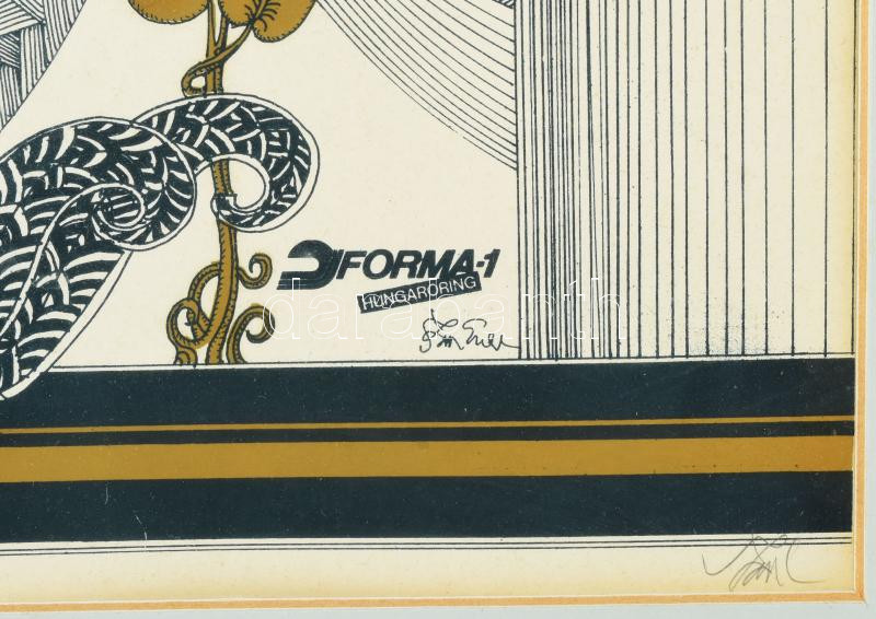 Szász Endre (1926-2003): A szárnyas isten. Szitanyomat, papír, jelzett, üvegezett keretben Forma 1 Hungaroring 1985? jelzett különlenyomat. 37x57 cm