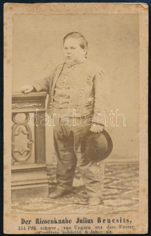 cca 1870-80 Kövér fiucska, 8 éves Bencsits Gyula, 154 font (kb. 70-80 kg), Pest vármegyéből. Keményhátú fotó, jelzés nélkül, karton alján német nyelvű felirattal, kissé kopott és foltos, 10,5×6,5 cm