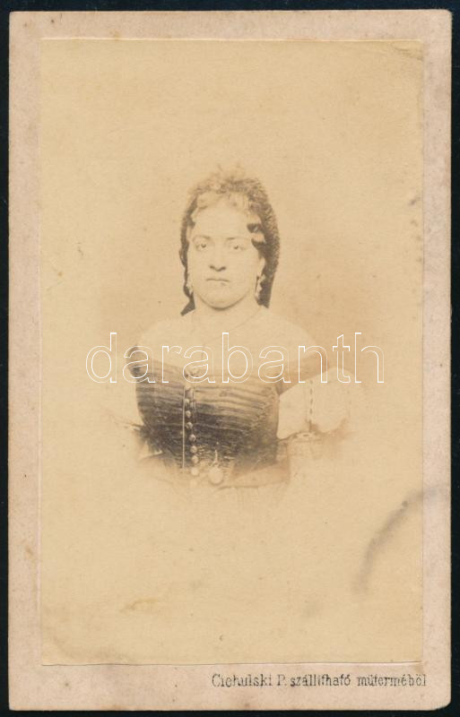 cca 1870 Előkelő hölgy portréja, vizitkártya Ciehulski P. szállítható műterméből (Marosvásárhely), ázott, 10x6,5 cm