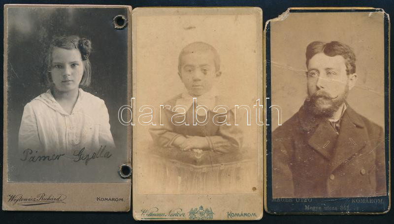 cca 1880-1910 3 db vegyes vizitkártya komáromi műtermekből, vegyes állapotban, 10,5×6,5 cm