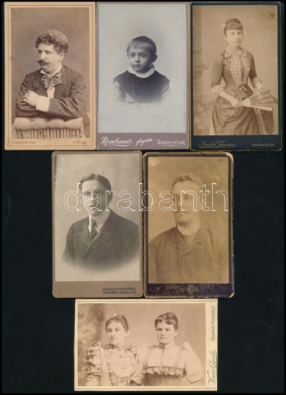Description: cca 1880-1910 Vegyes portrék különböző vidéki műtermekből (Somogyi Testvérek Veszprém, Rembrandt fényirda Székesfehérvár, Lauscher és Társa Szeged, stb.), 6 db vizitkártya, változó állapotban, 10,5x6,5 cm körül